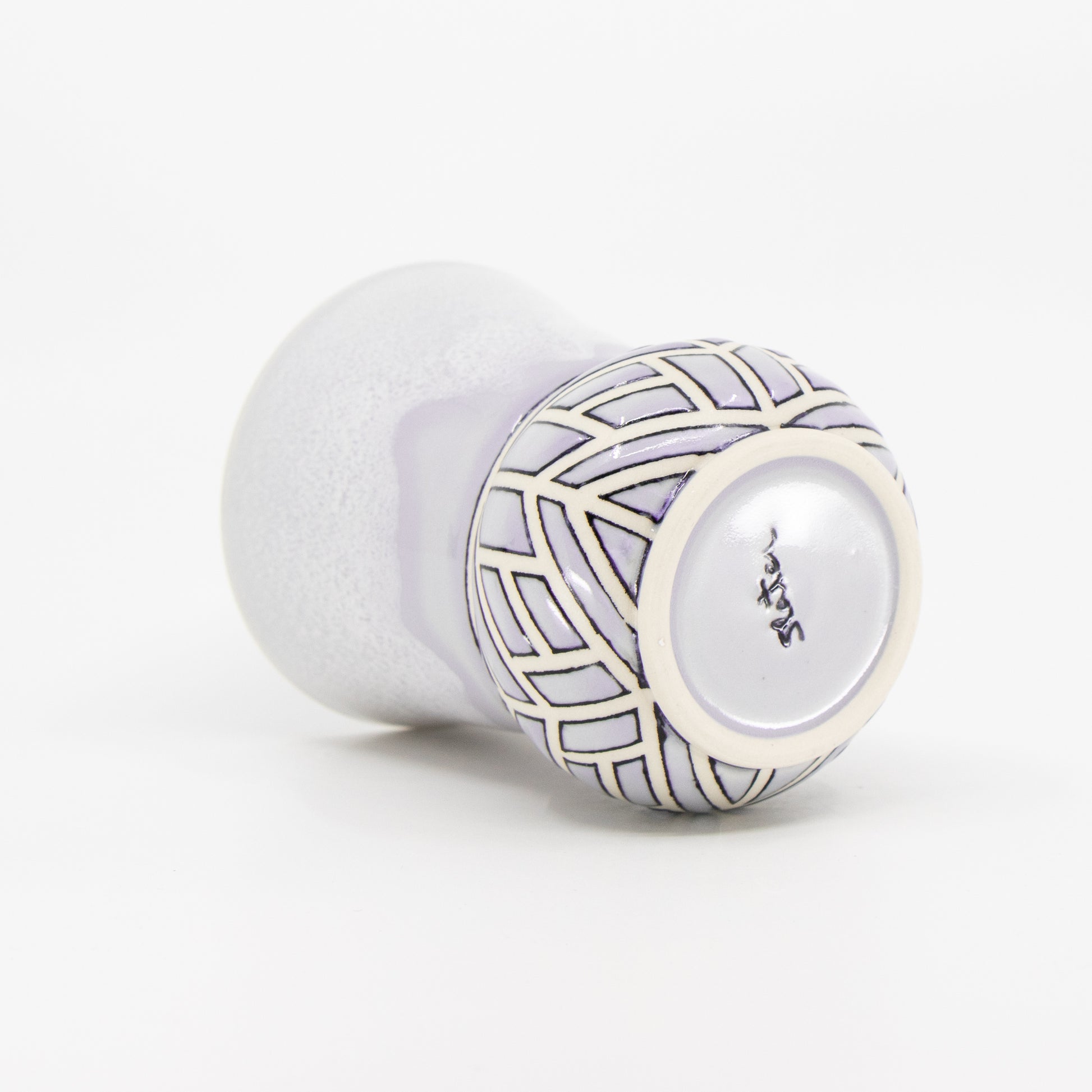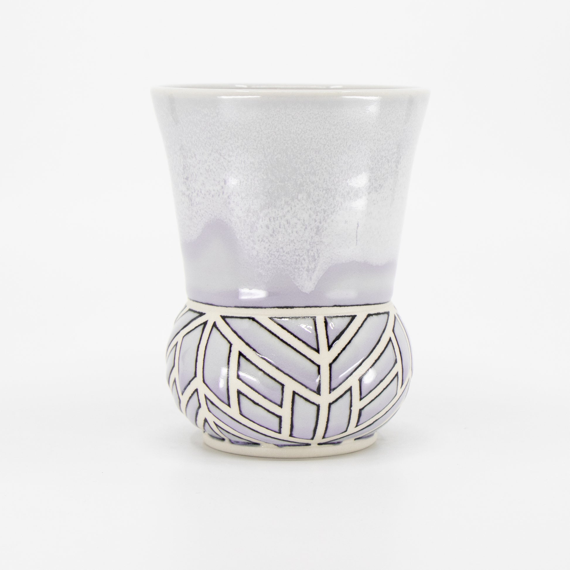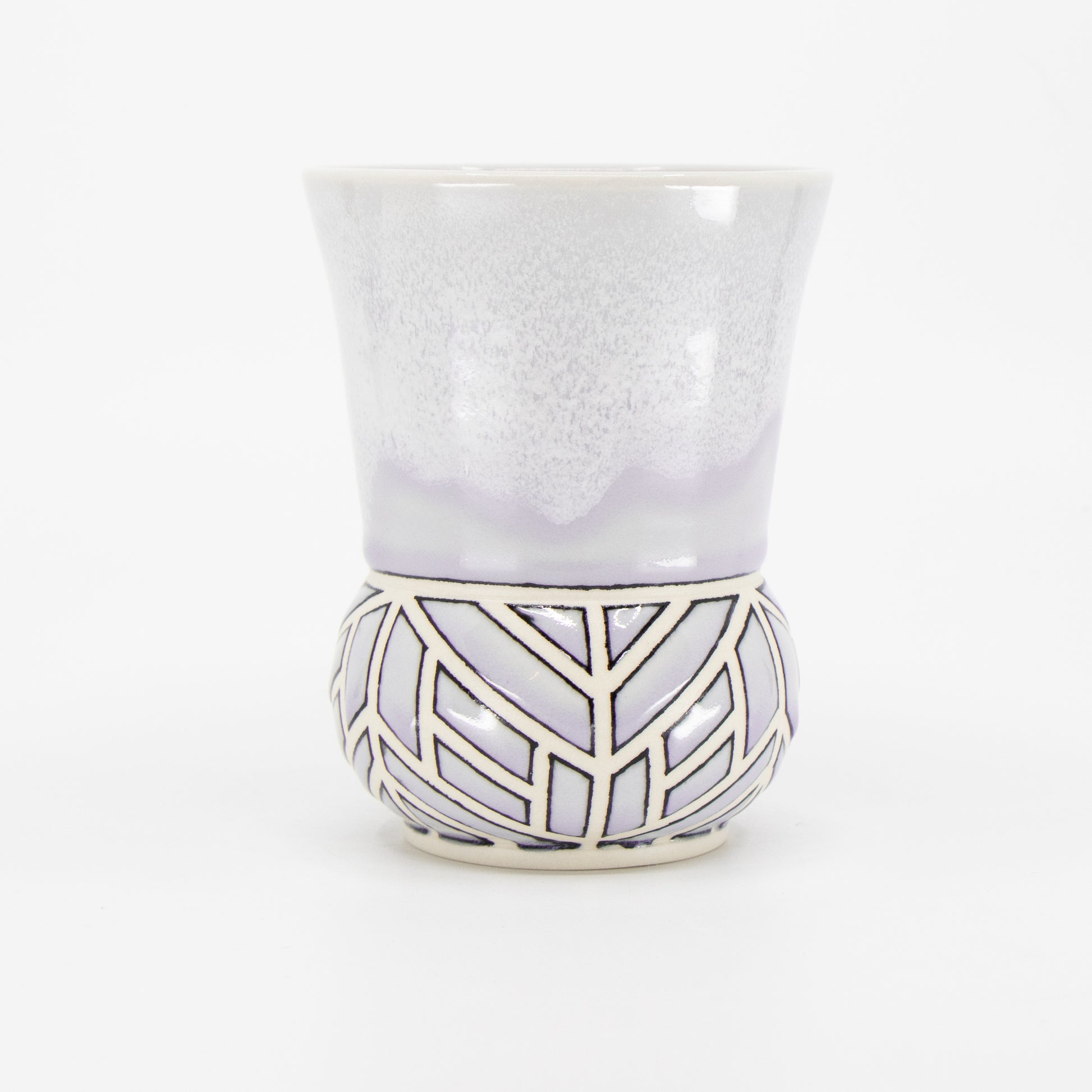 Wheelthrown porcelain cup with tape resist pattern, black underglaze lines, and glaze. The tape resist leaves a very tactile surface.