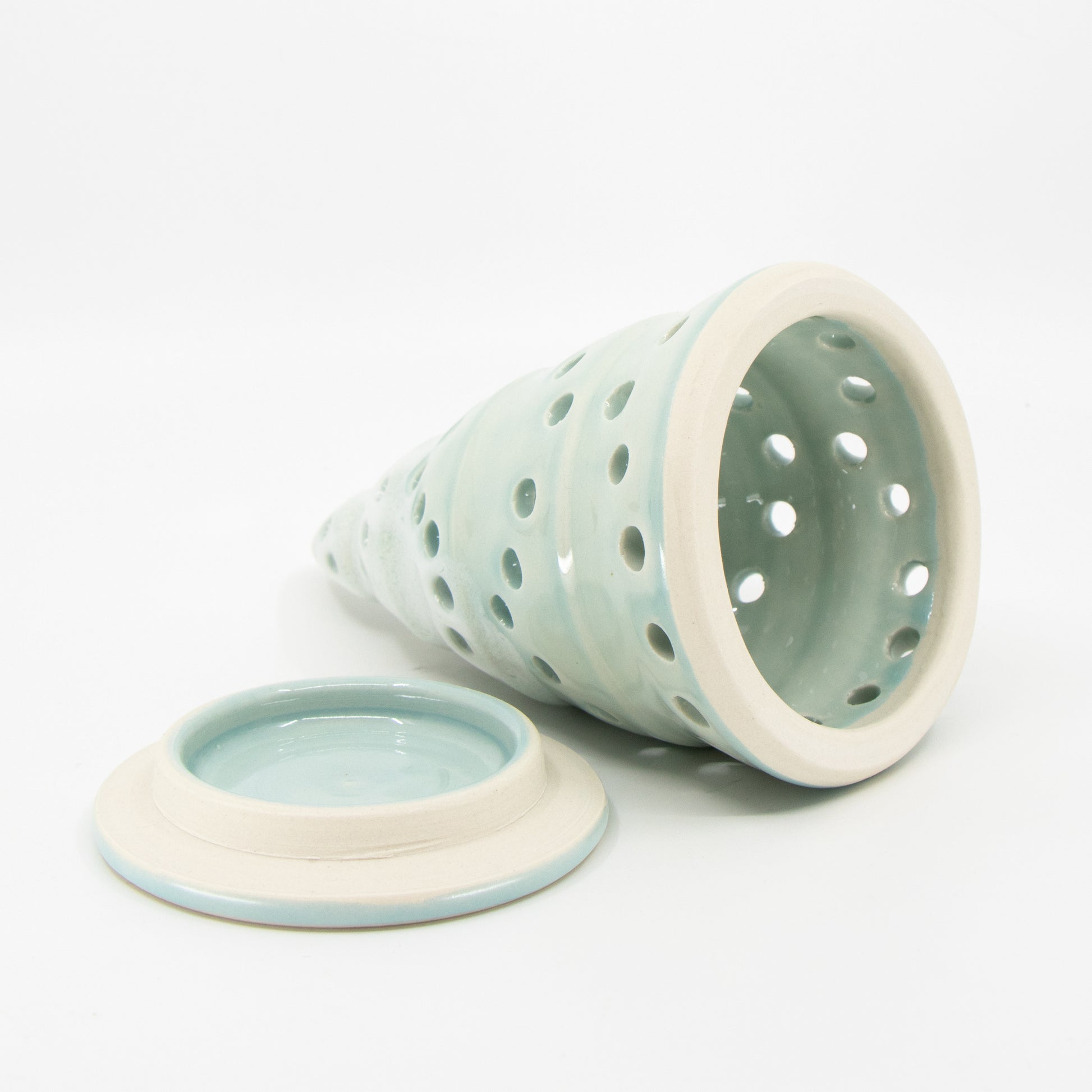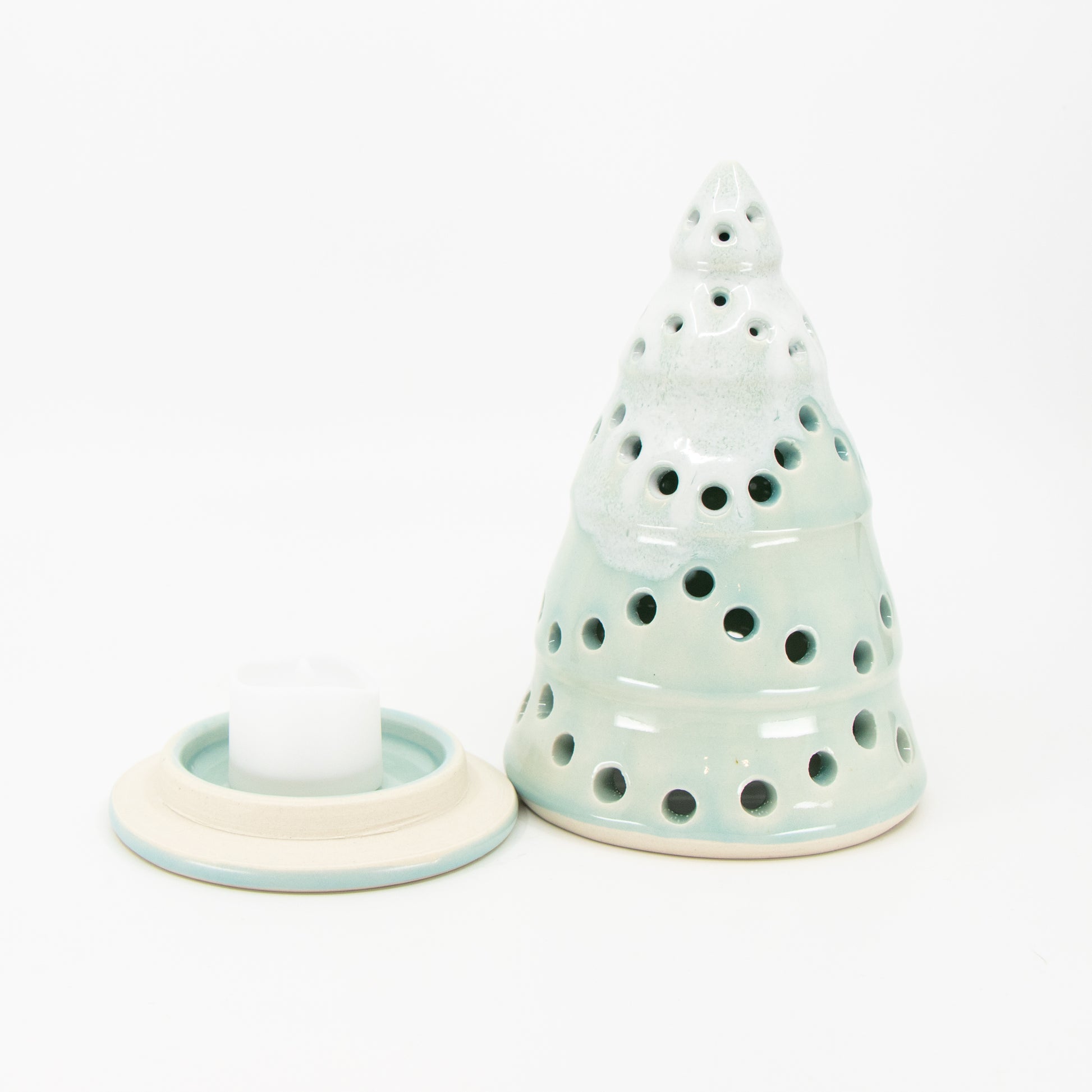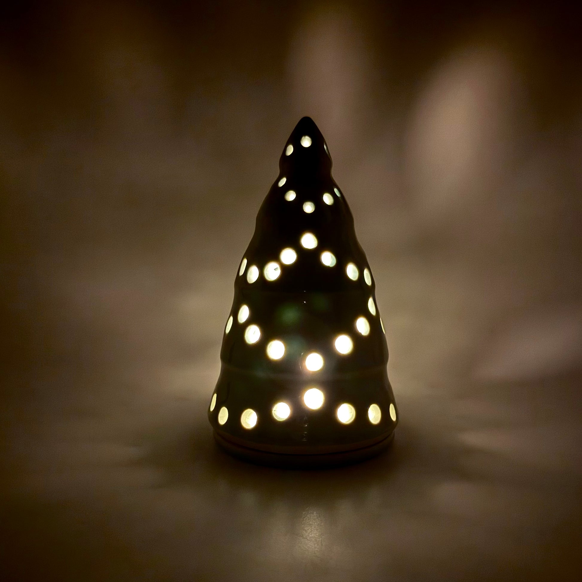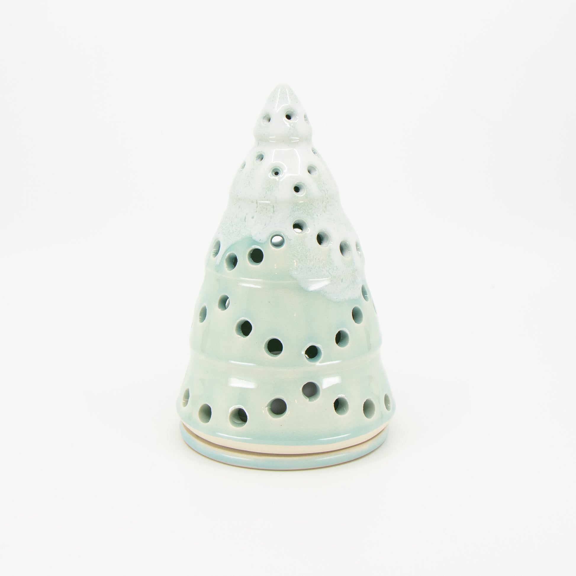 Wheelthrown porcelain tree luminary with pierced holes in a garland pattern. Celadon and snowy white glaze. Comes with a base so that you can burn a real candle.