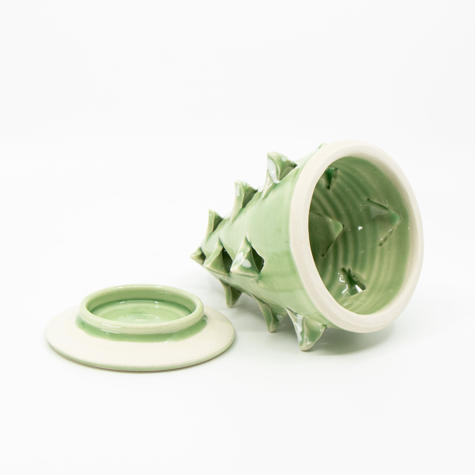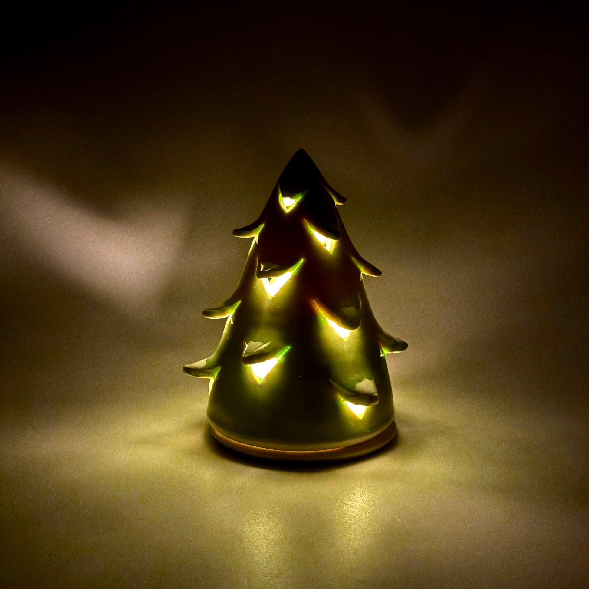 Wheelthrown and altered porcelain tree luminary in peridot with snowy white glaze. Comes with a base so that you can burn a real candle.