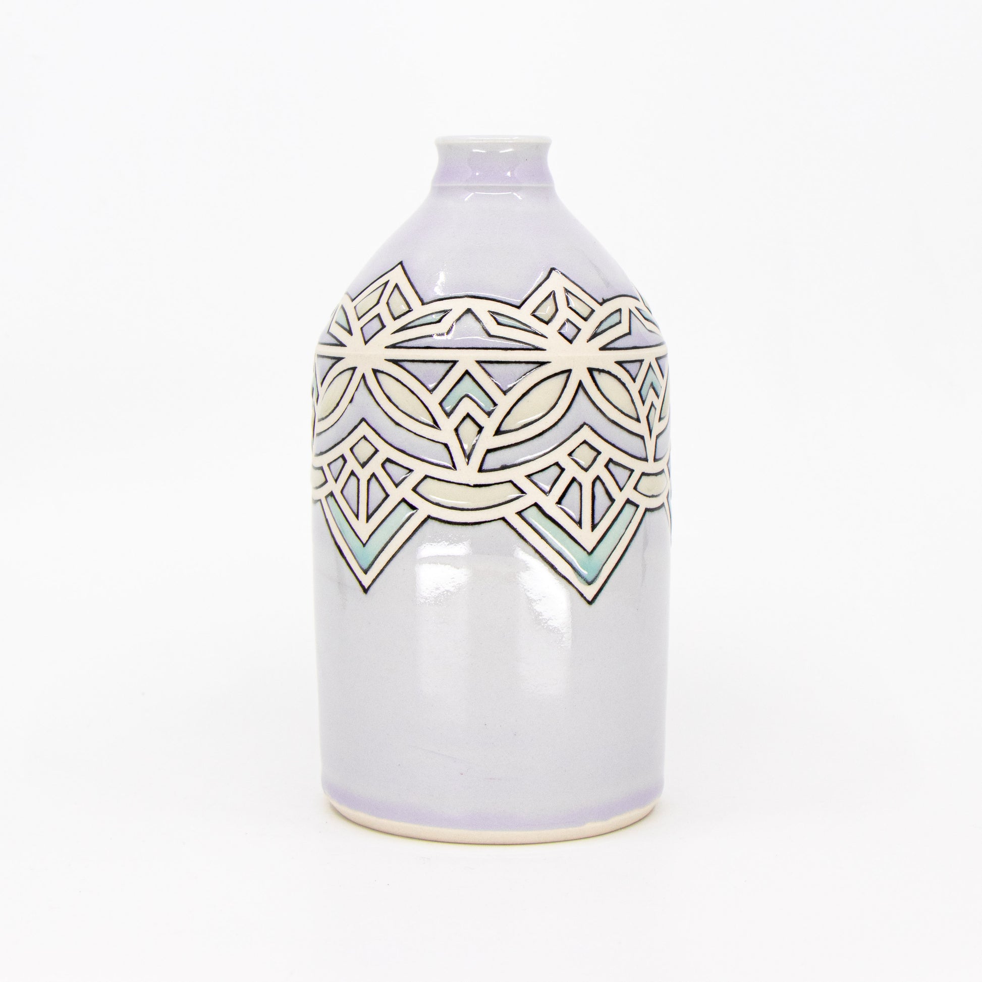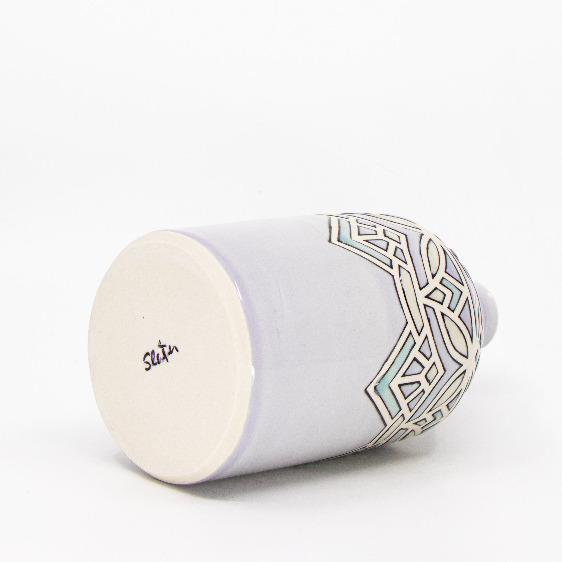 Wheelthrown porcelain vase with tape resist pattern, black underglaze lines, and glaze. The tape resist leaves a very tactile surface.