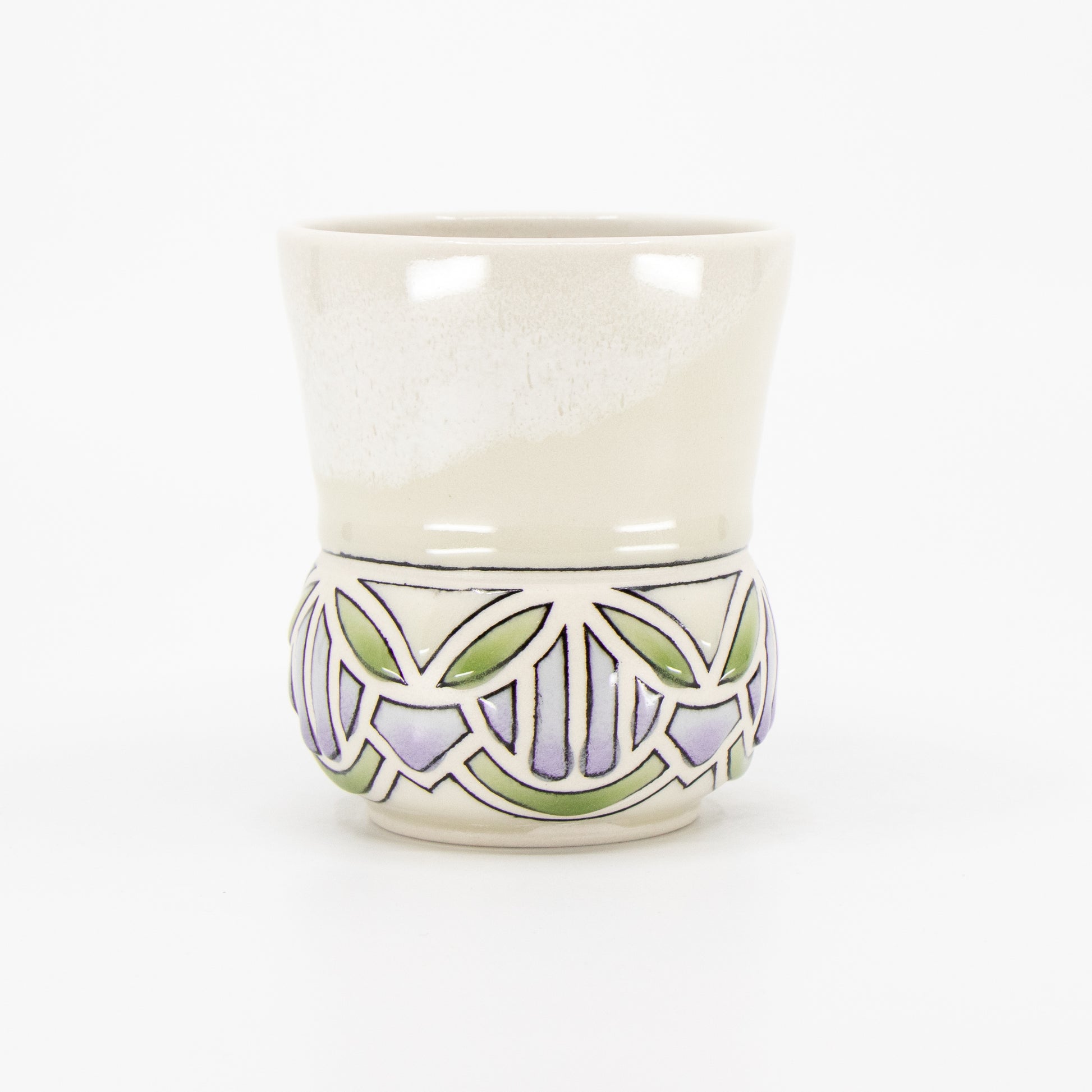 Wheelthrown porcelain cup with tape resist pattern, black underglaze lines, and glaze. The tape resist leaves a very tactile surface.