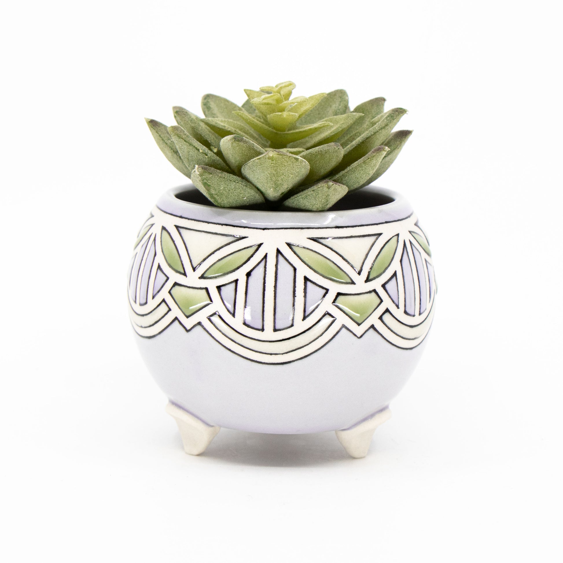Wheelthrown porcelain planter with tape resist pattern, black underglaze lines, and glaze. Handbuilt feet and drainage hole.