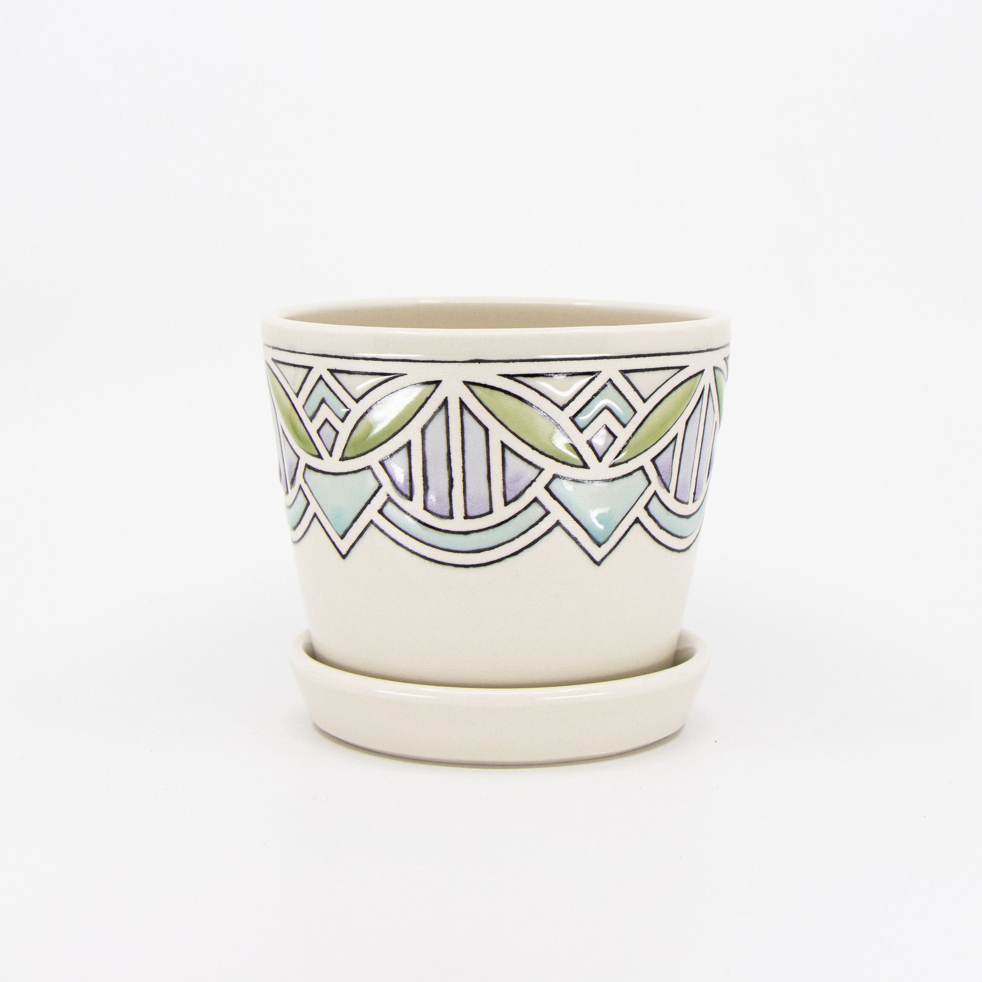Wheelthrown porcelain planter with tape resist pattern, black underglaze lines, and glaze. Has drainage hole and comes with tray. Holds a 4" plant. The tape resist leaves a very tactile surface.