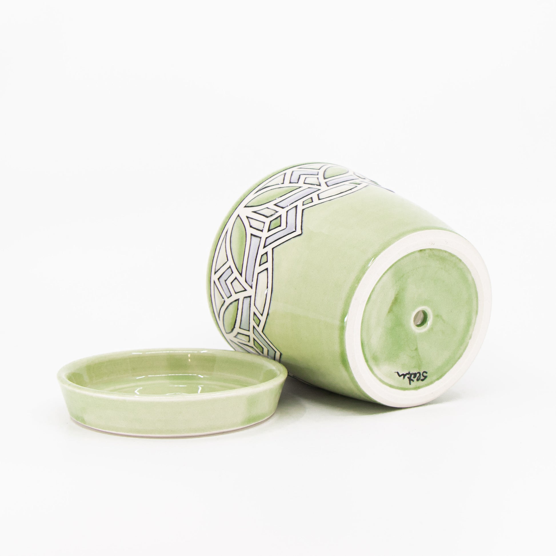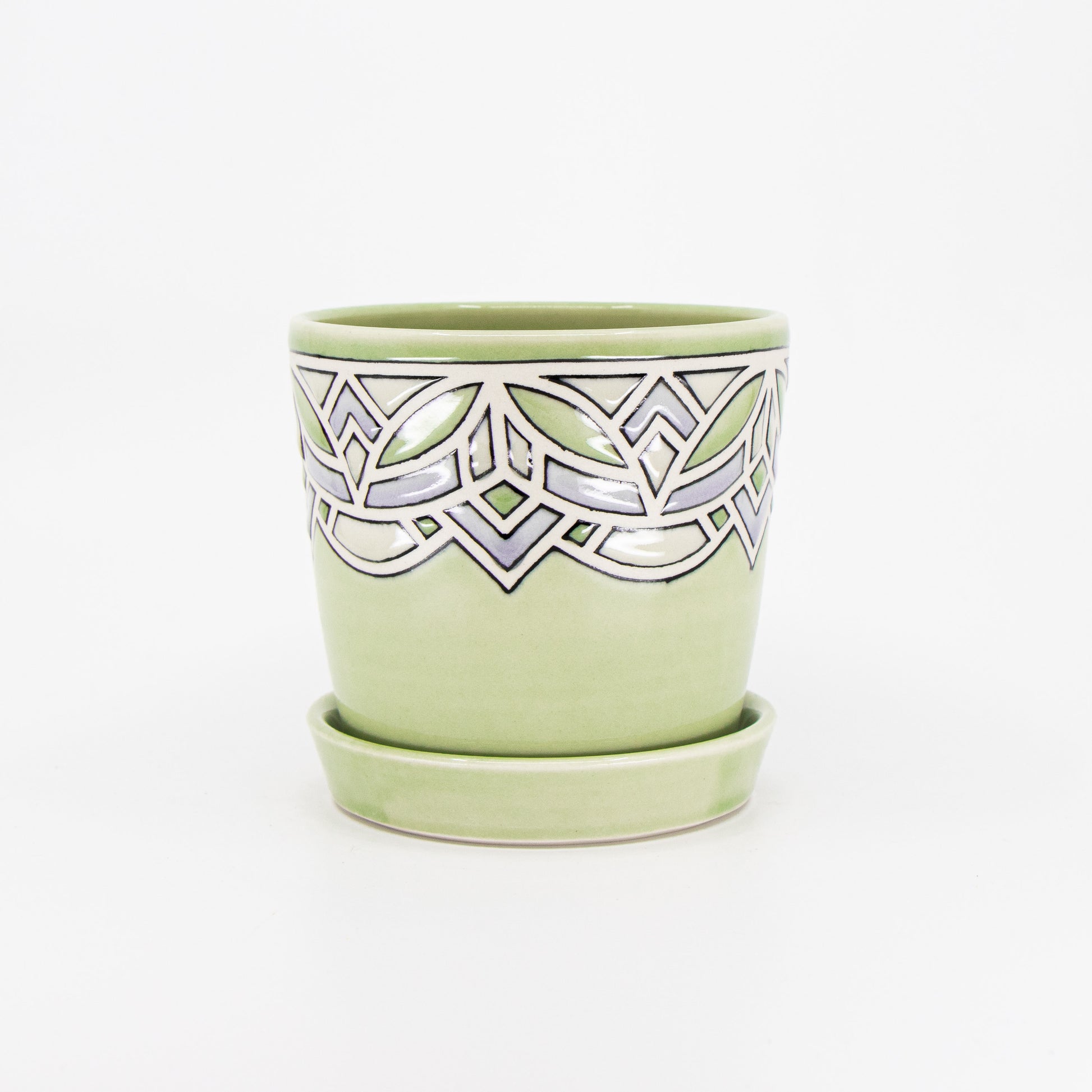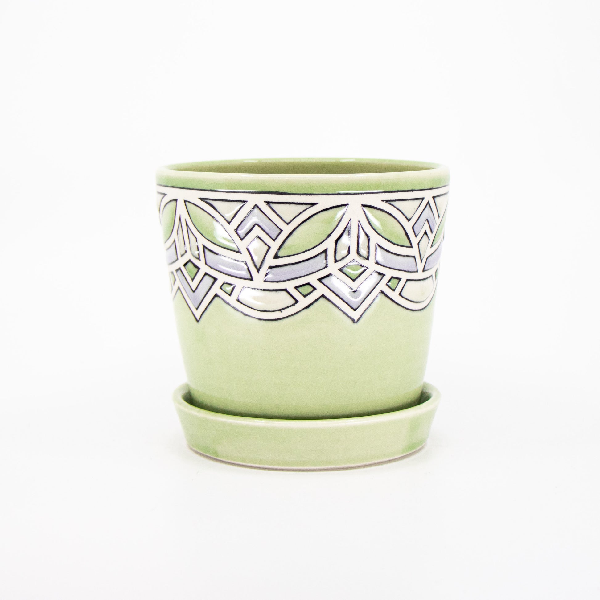 Wheelthrown porcelain planter with tape resist pattern, black underglaze lines, and glaze. Has drainage hole and comes with tray. Holds a 4" plant. The tape resist leaves a very tactile surface.