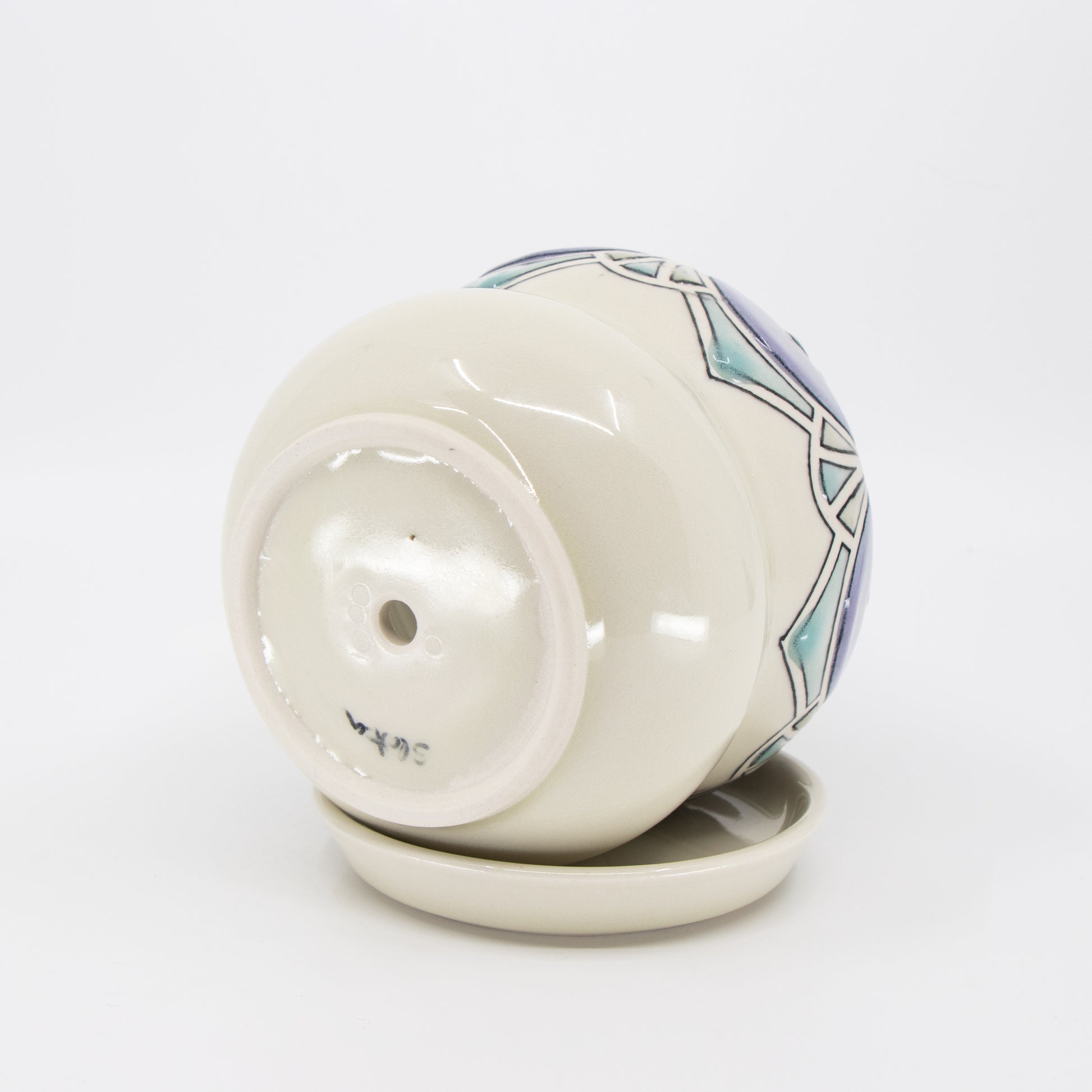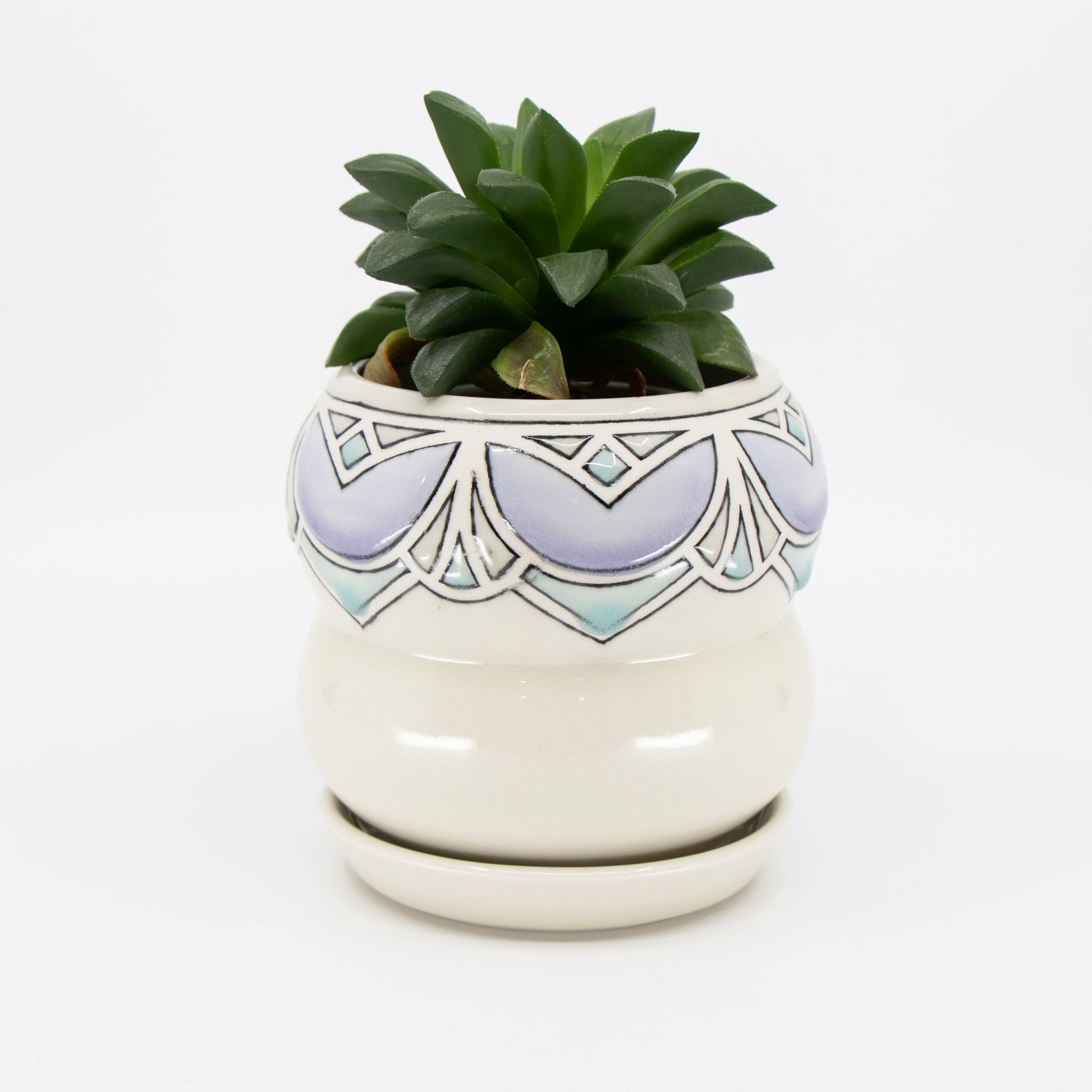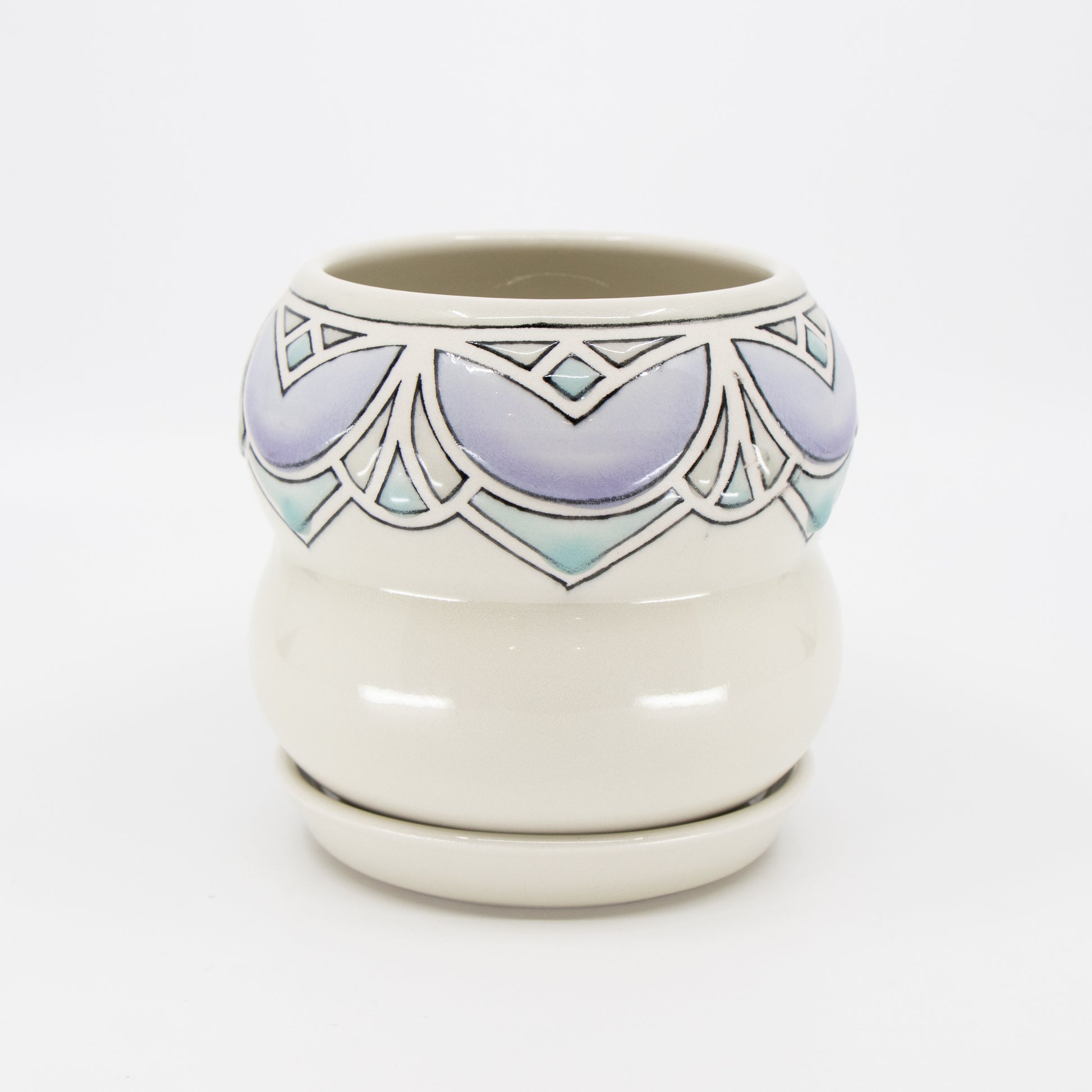Wheelthrown porcelain planter with tape resist pattern, black underglaze lines, and glaze. Has drainage hole and comes with tray. Holds a 4" plant.