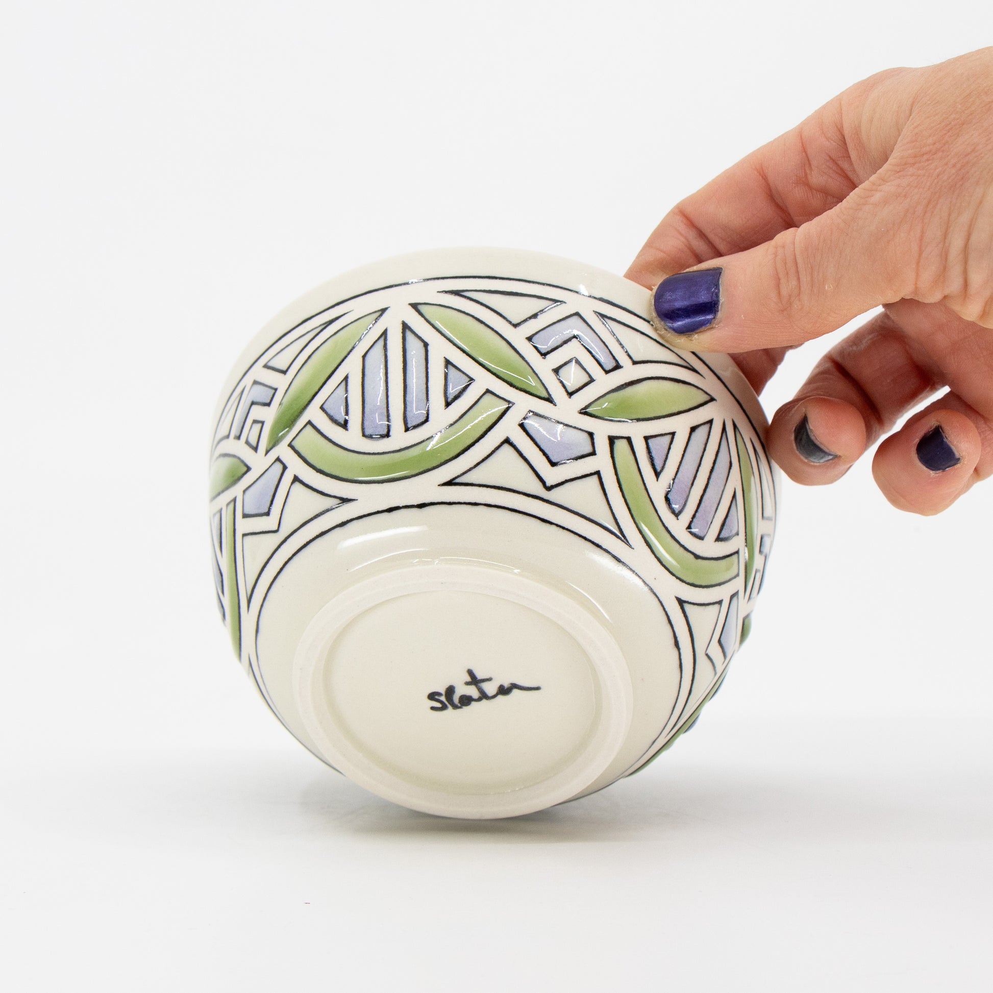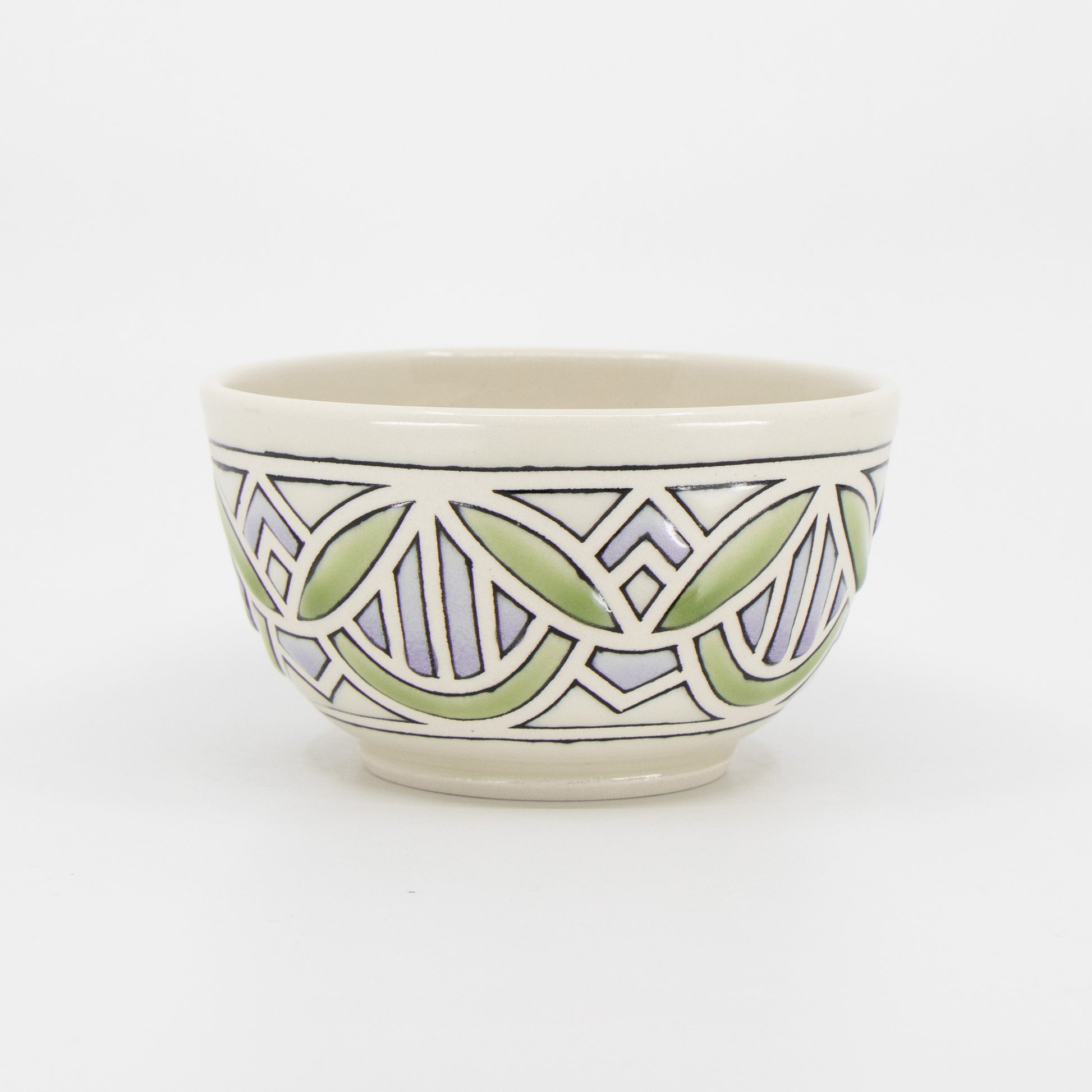 Wheelthrown porcelain bowl with tape resist pattern, black underglaze lines, and glaze. The tape resist leaves a very tactile surface.