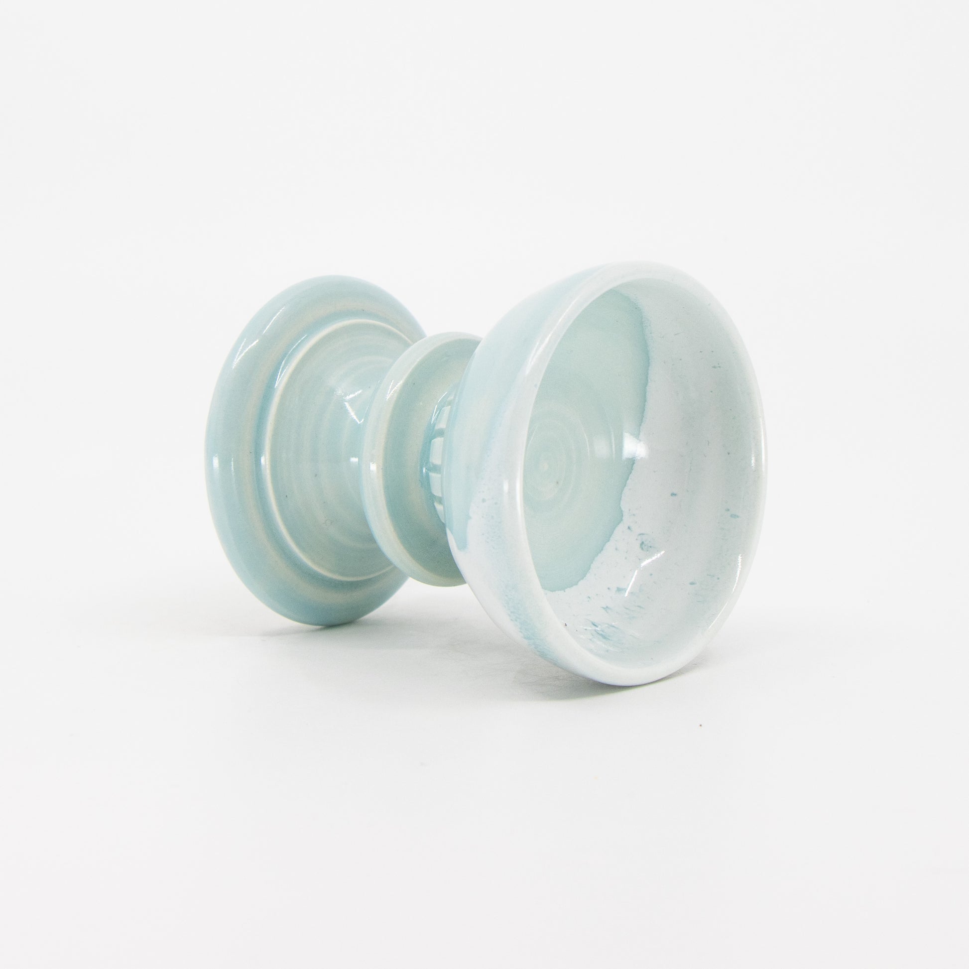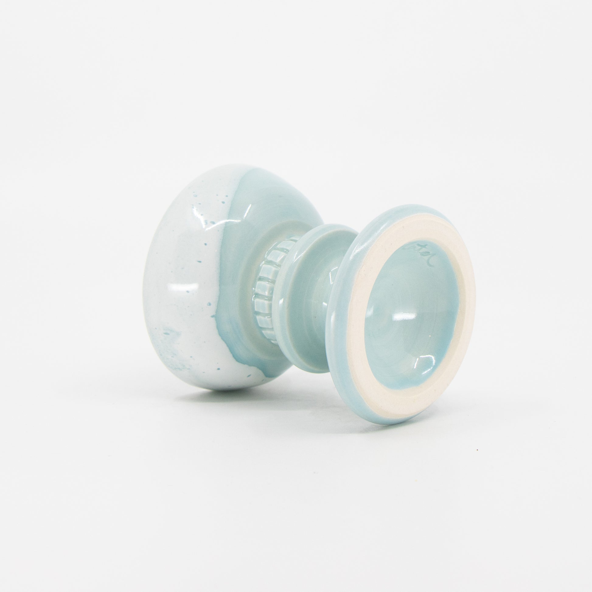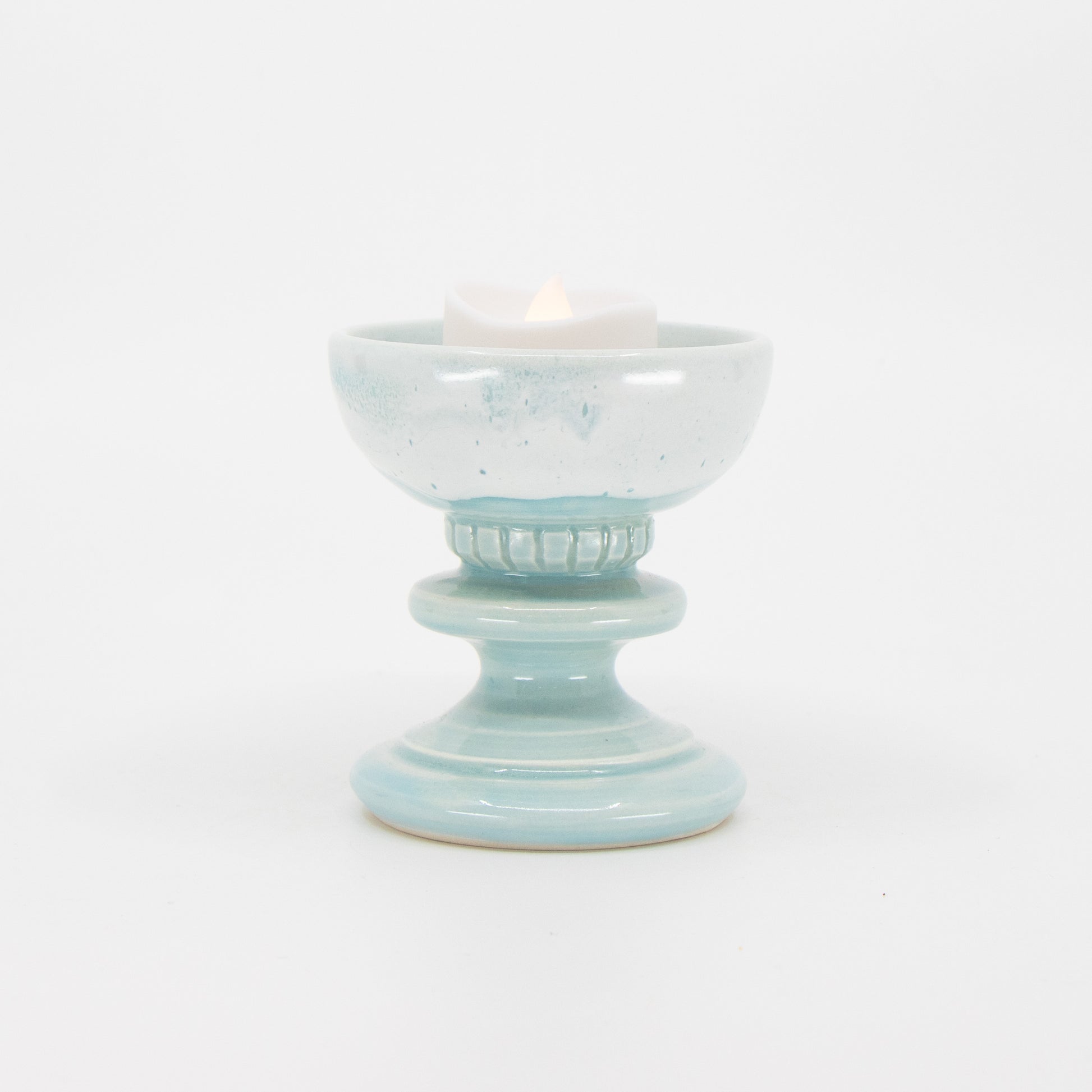 Wheelthrown porcelain votive or tea light candle holder with carving detail. Glazed in celadon with a snowy white glaze on top.