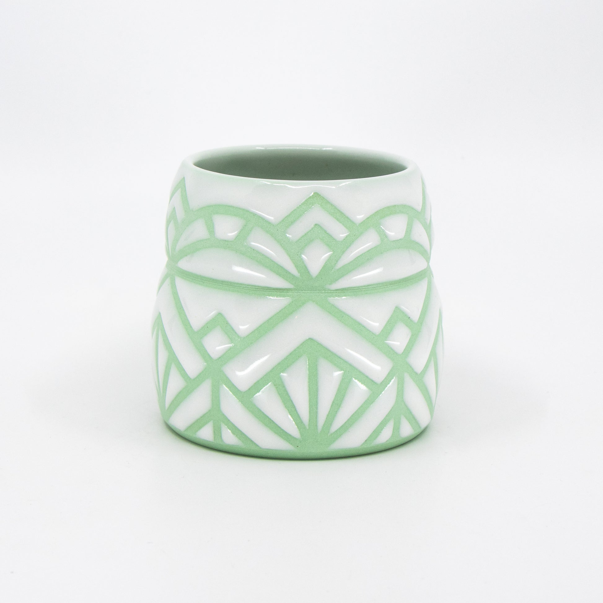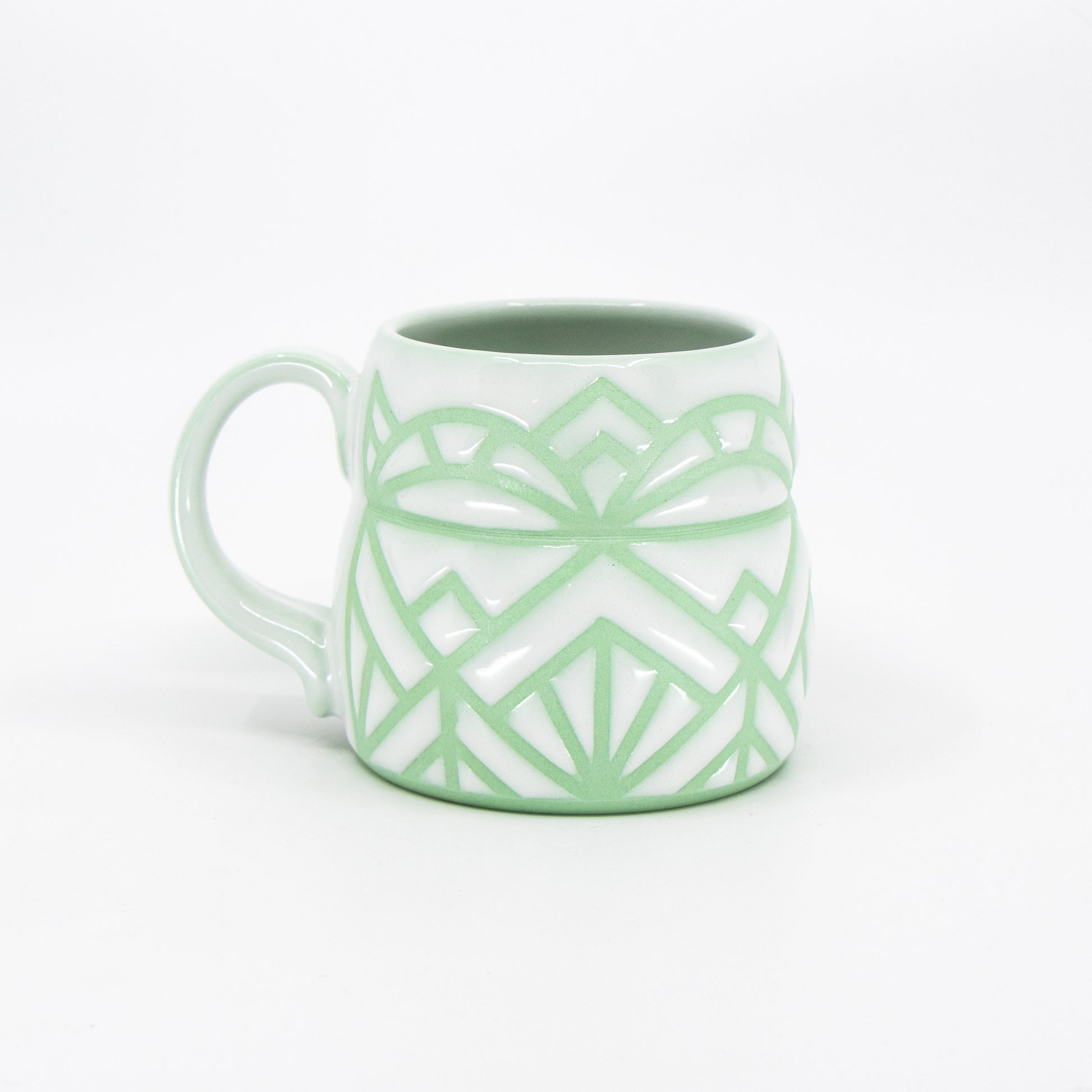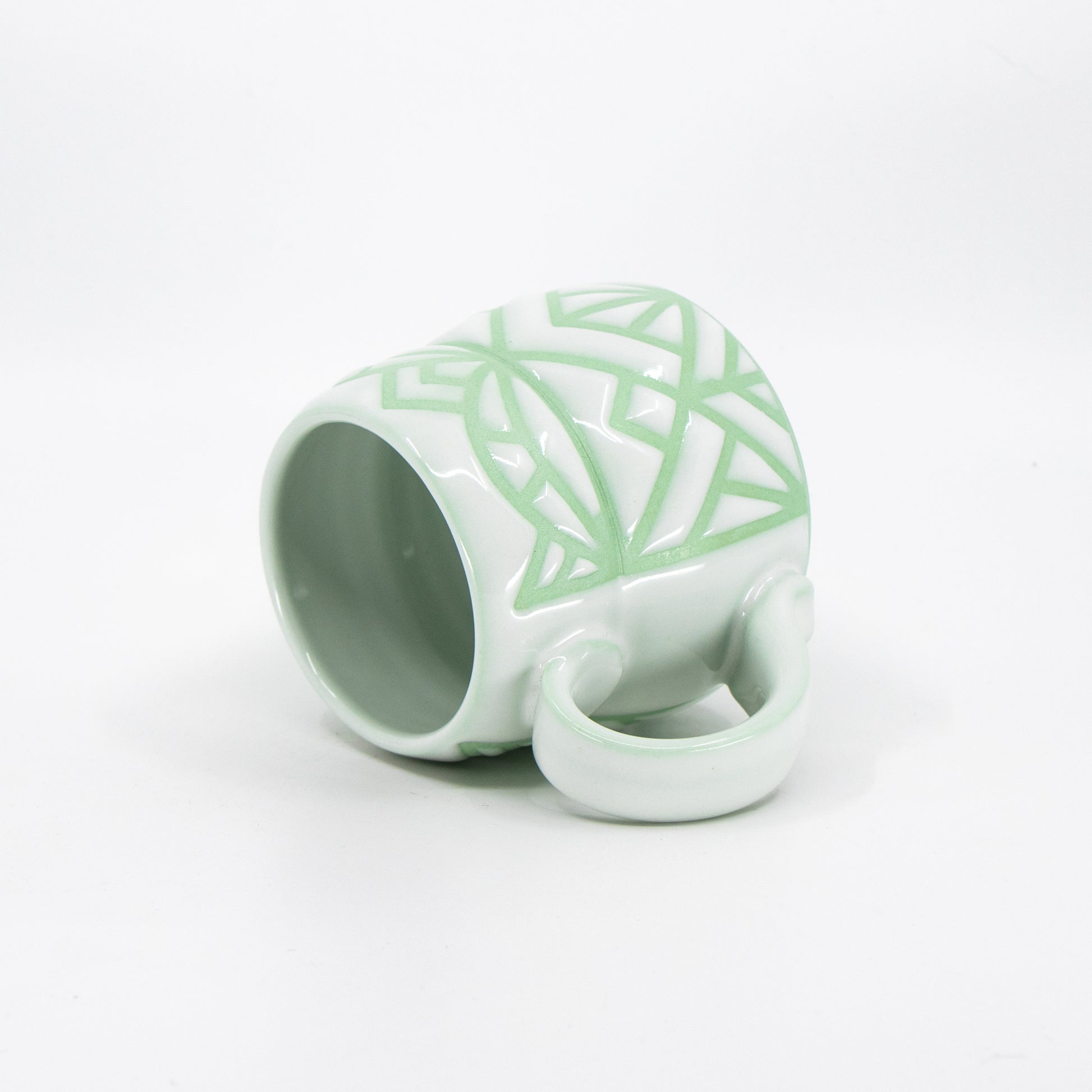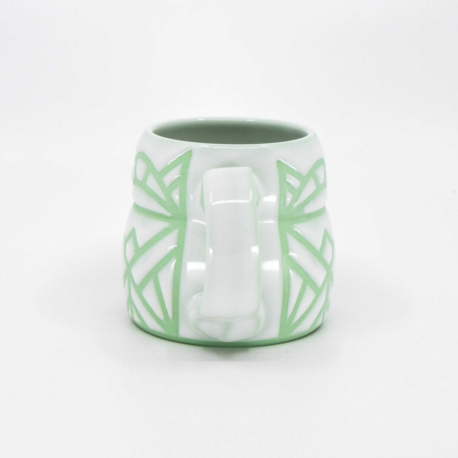Wheelthrown green-stained porcelain mug with tape resist pattern and glossy white glaze.